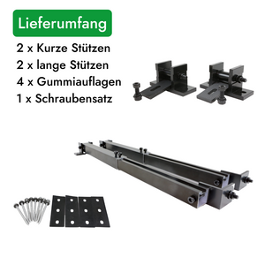 Die Aufständerung ermöglicht eine unkomplizierte Installation von Solarmodulen auf Flachdächern, mit kleinen Winkeln an der Vorderseite und ausfahrbaren Stützen hinten für eine optimale Ausrichtung. Zusätzlich ist die Halterung auch für Wandmontagen konzipiert, was eine einfache Befestigung der Solarmodule an Wänden erlaubt.