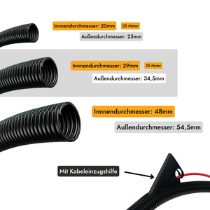 Mit einer Auswahl von drei verschiedenen Innendurchmessern – Ø20 mm, Ø29 mm und Ø48 mm – und einer beeindruckenden Länge von 25 Metern, bietet dieses Wellrohr maximale Flexibilität für Ihre Bedürfnisse.
